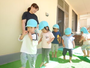 園庭やテラスで身体を動かしたり 幼児クラスのかけっこが始まればがんばれー!!とみんなで応援しています。
