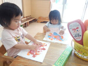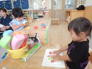 製作ではサランラップ越しに絵の具をツンツンムニムニ広げ、感触を味わいましたよ。