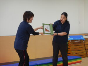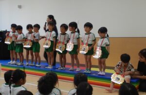 緊張していましたが、みんなの前で名前を呼ばれると、元気にハイの返事ができました。先生からカードのプレゼントをもらって嬉しい笑顔に♡