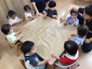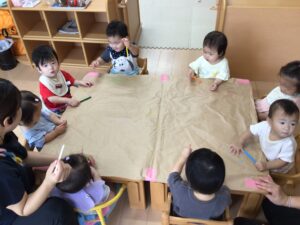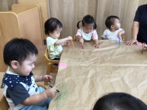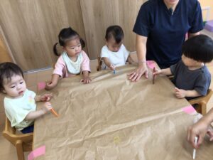少しずつ自分でできることも増えお絵かきをしました。紙に色がつく様子を不思議そうに眺めたり、様々な色を楽しんでいました。