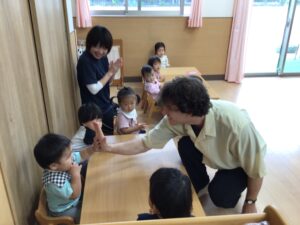初めての先生に戸惑う子ども達ですが、音楽に合わせて踊ったり楽しい時間を過ごすと、ハイタッチで挨拶ができるようになりました!