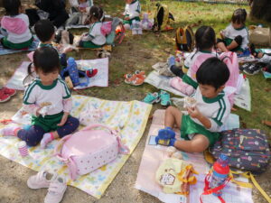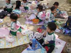 レジャーシートを広げ、お家の方が作ってくれたおにぎりを嬉しそうに