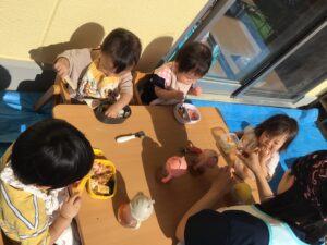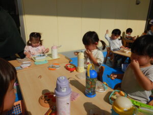 園に戻って、待ちに待ったお弁当タイム★テラスで秋風を感じながら嬉しそうに食べていました!