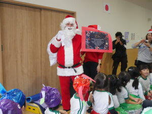 「サンタさん?!」「どこ?!」と窓の外を覗く子どもたち。