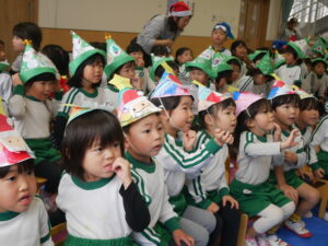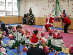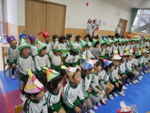 ♩赤鼻のトナカイを歌ってスタートし、次はパネルシアター『あわてんぼうのサンタクロース』を見ました。鈴やマラカスなど賑やかな楽器隊と一緒に手拍子したり口ずさんだりしながら見ていた子どもたちです。