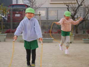 そんならいおん組さんは、鬼ごっこをしたり、縄跳びにも挑戦中!前回りだけでは満足いかず、「新しい技教えて!」と交差飛びや後ろ回しで回数をのばしている様子も見られています。