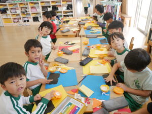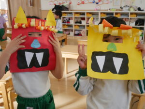 2月の節分の行事に向けて、鬼のお面の製作を行っています。鬼の顔を好きな色で選び、顔のパーツを自分たちで切って貼っていきました!「歯をもっと増やしたい!」「鬼の角に模様を描きたい!」とそれぞれが考えながら個性を出して製作を楽しんでいました!