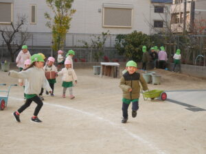 まだまだ寒い日が続いていますが、子どもたちはいつも元気いっぱい!「暑いから上着脱ぐ!」と入り口近くの机には上着がどっさり置かれていることもあります。