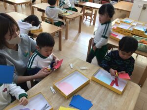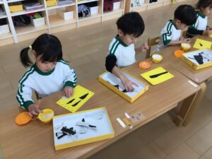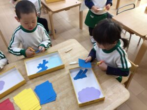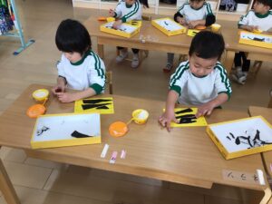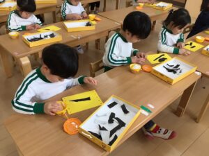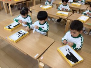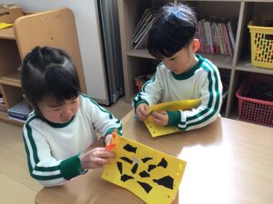 お面は、鬼の髪の毛を切りました。少し長い直線も連続切りが上達してきて、線に合わせて切り進めていましたよ♪