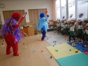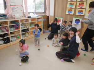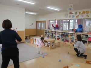その後各クラスに戻り、鬼の顔の的あて遊びをしました。すると…そこで