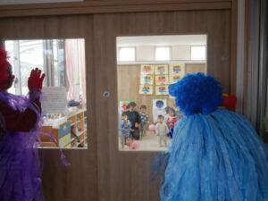 窓からのぞいてきた鬼にびっくりしながらも先生たちと一緒に頑張って豆をまいていました。