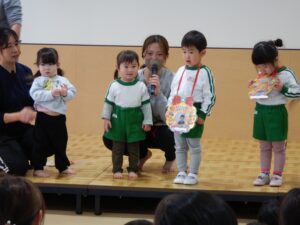 「〇〇です」「〇歳になりました」上手に発表したり、お友だちからの質問にも、元気に答えてくれました!