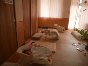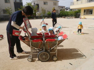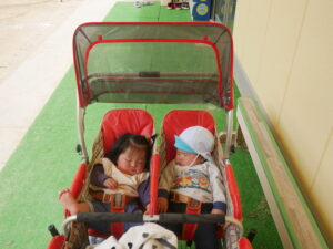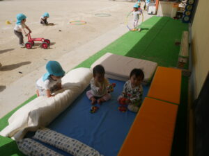 お天気のよい日はベビーカーに乗って園内を散歩したり、お砂場で砂をにぎにぎして感触を楽しんだり。テラスではマットを敷いてひなたぼっこをするなど、ゆったりとした時間を過ごしています。