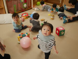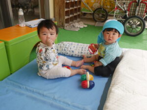 入園当初は、お部屋中元気な泣き声が響いていましたが、少しずつ園の環境にも慣れ、かわいい笑顔がたくさん見られるようになってきました♫