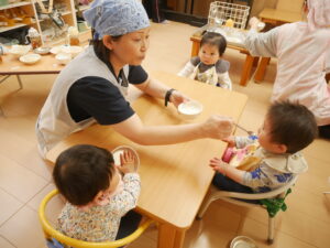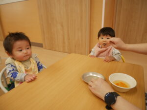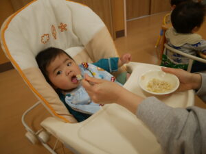ひよこ組の子どもたちは食べることが大好き♡ 離乳食は食べてくれるか心配したのですが、ほとんどの子がモリモリしっかりと食べてくれています。