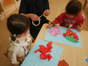 花紙をくしゅっと丸めてぺったん!指先を上手に使いながら頑張っていました。 「できたね~!」と声をかけると、 パチパチと手を叩いて大喜びする姿も見られましたよ👏✨