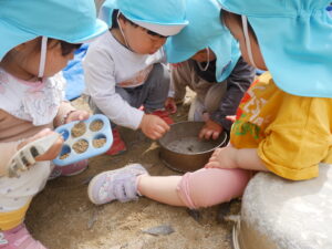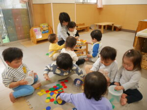 遊びの時間は、 それぞれ好きなことを見つけて楽しんでいます♪ 室内ではおままごとや絵本、 ポットン落としなどに夢中に… 戸外ではダンゴムシが大人気! 「ちょっと怖いけど気になる…」そんな気持ちが伝わってきて、勇気を出して“ちょんっ”と触る姿も見られています!