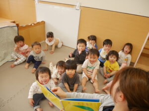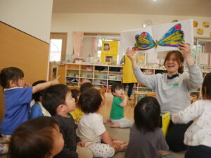 絵本タイムでは「もこもこもこ」が大人気! 「もこっ」「にょきっ」のフレーズに大爆笑の子どもたちです(*^▽^*)